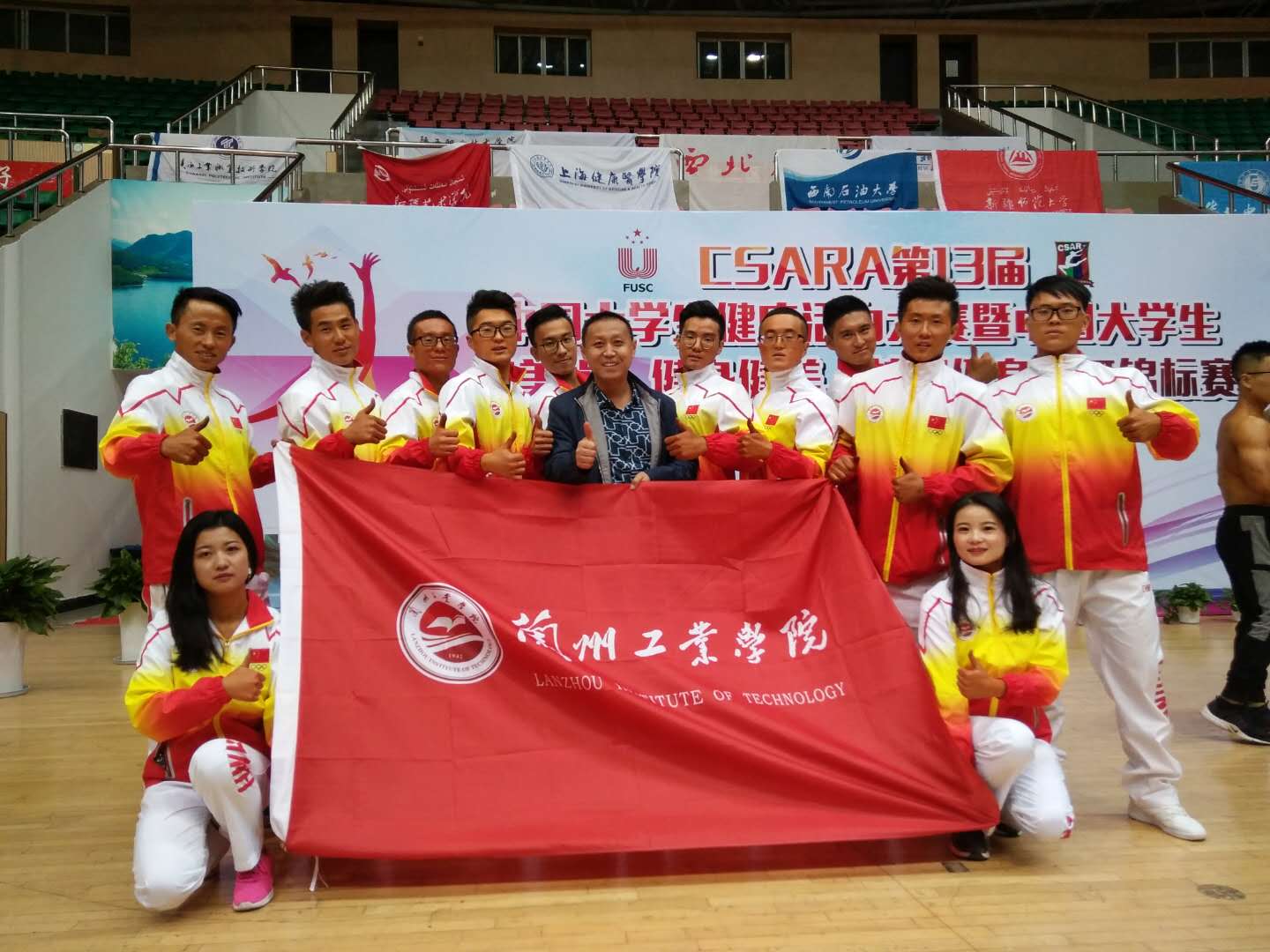 11月20日至27日,第13届中国大学生健康活力大赛在浙江省淳安县举行。来自全国180所高校的2000余名运动员参加了健美操、健身健美、校园健身操三大项的比赛。经过三天紧张激烈的比拼,我校健美队取得了优异成绩,其中机电(本)16-1班王寅宽获男子健身先生B组一等奖、软件(本)16-2班常翔程获男子75公斤以上健美二等奖、土木(本)15-4班罗延伟获男子75公斤以上健美二等奖、材控(本)15-3班刘辉斌获健身先生A组二等奖、土木(本)14-1班方重国获健身模特A组二等奖、通信(本)16-1班孙宇辰获健身模特B组二等奖、会计(专)15-1班朱翻红获比基尼小姐B组二等奖、财管(本)15-2班张宗礼获男子75公斤以下健美三等奖、焊接16-3班郭雄雄获男子健体A组三等奖、机电(本)15-1班苟成元获男子健体A组三等奖、车辆(本)17-1班杜森获男子健体B组三等奖、人力15-1班魏冬梅获比基尼小姐A组三等奖。体育部教师敬德权获 “优秀教练员”奖。